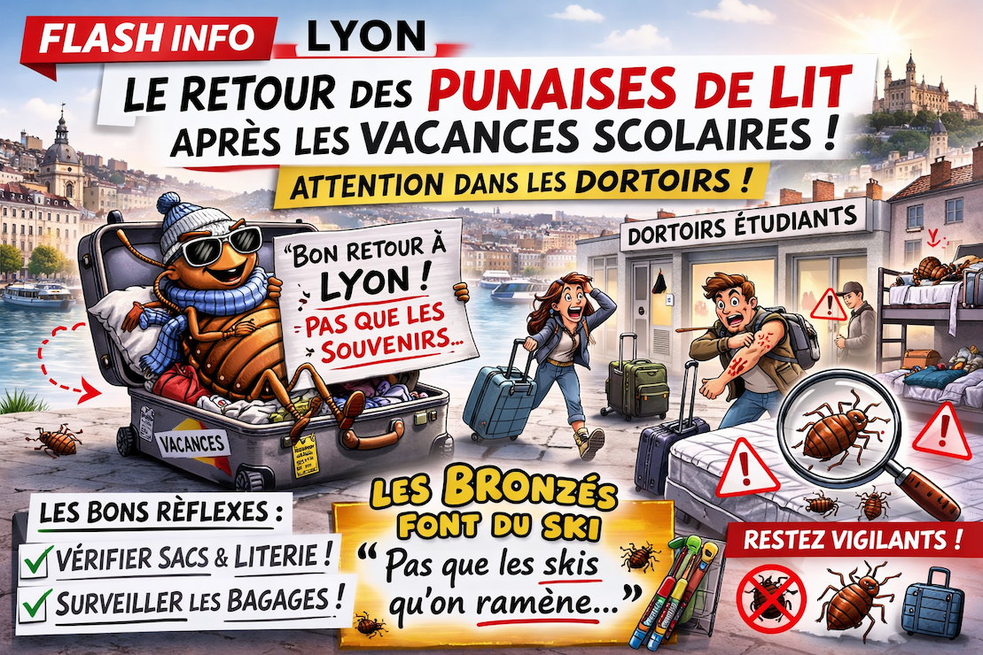 C’est le retour en classe… et avec lui, le come-back des punaises de lit à Lyon après les récentes vacances scolaires. Comme chaque période de déplacements — notamment après les vacances — ces petites bestioles sournoises profitent des valises, dortoirs et auberges pour voyager d’une chambre à une autre et s’installer dans des appartements, hôtels ou lieux collectifs.